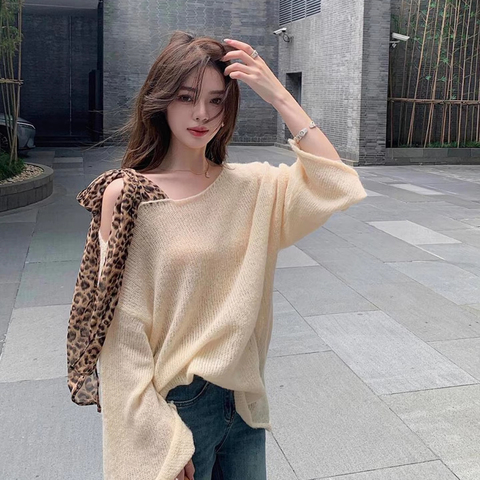 Tops de punto para mujer de principios de otoño estilo americano chica picante estampado de leopardo Correa fuera del hombro manga larga Pure Desire Goddess