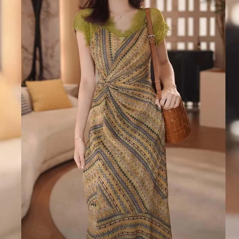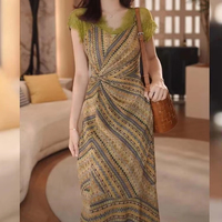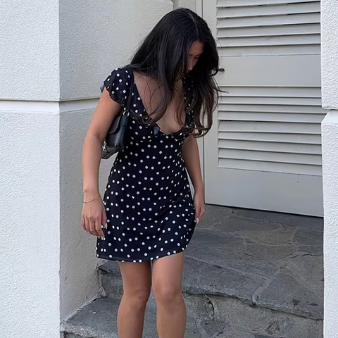 Vestido Vintage Spicy Girl estilo punteado Sexy con cuello en V gasa cintura-ceñido a la cintura falda informal versátil con deseo puro