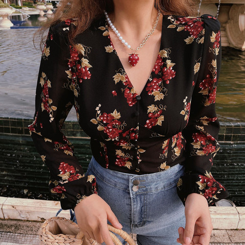 Top adelgazante abotonado con cuello en V con estampado de uva retro de longitud corta con manga de burbuja y patrón geométrico bordado