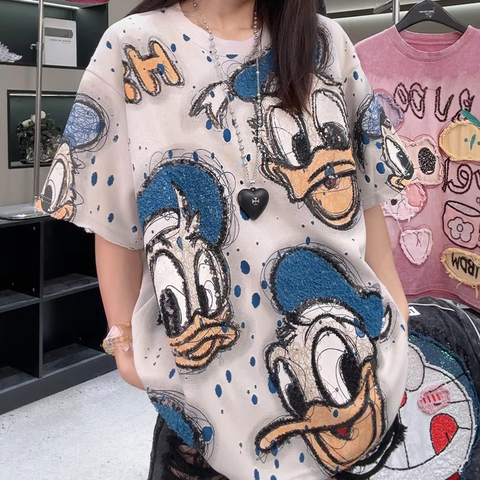 Camiseta de manga corta de pato Donald para mujer de principios de otoño 2025, industria pesada, nuevo diseño de agujeros, bonito patrón 3D ajustado
